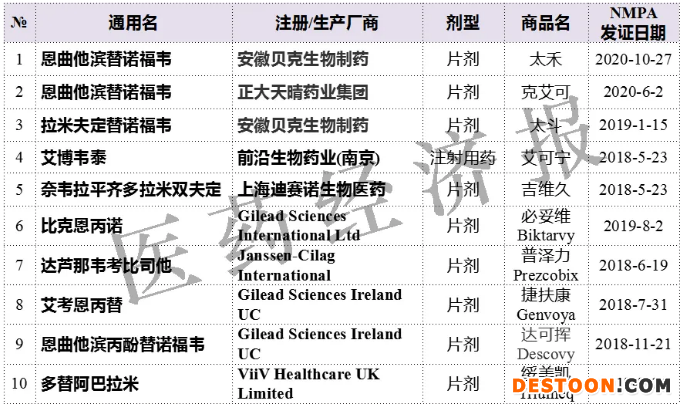 國(guó)家藥監(jiān)局官網(wǎng)數(shù)據(jù)顯示,目前有注冊(cè)生產(chǎn)批文的抗HIV單方藥及復(fù)方制劑有30個(gè)。2017年-2020年11月NMPA批準(zhǔn)了10家公司注冊(cè)生產(chǎn)的9個(gè)抗HIV治療復(fù)方藥物和長(zhǎng)效創(chuàng)新藥物。國(guó)家創(chuàng)新Ⅰ類(lèi)抗HIV新藥艾博韋泰注射用藥由前沿生物藥業(yè)(南京)上市,商品名為艾可寧。