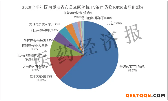 圖4 2020上半年國(guó)內(nèi)重點(diǎn)省市公立醫(yī)院抗HIV藥物TOP10份額占比