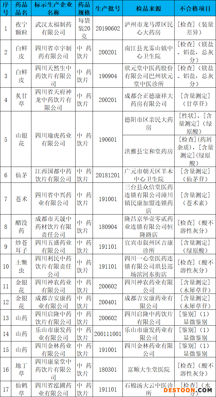 梳理發(fā)現(xiàn),17批次不合格藥品中,只有一批次為制劑(夜寧顆粒),其余全為中藥飲片,包括山藥、白鮮皮、炙甘草、山銀花等。