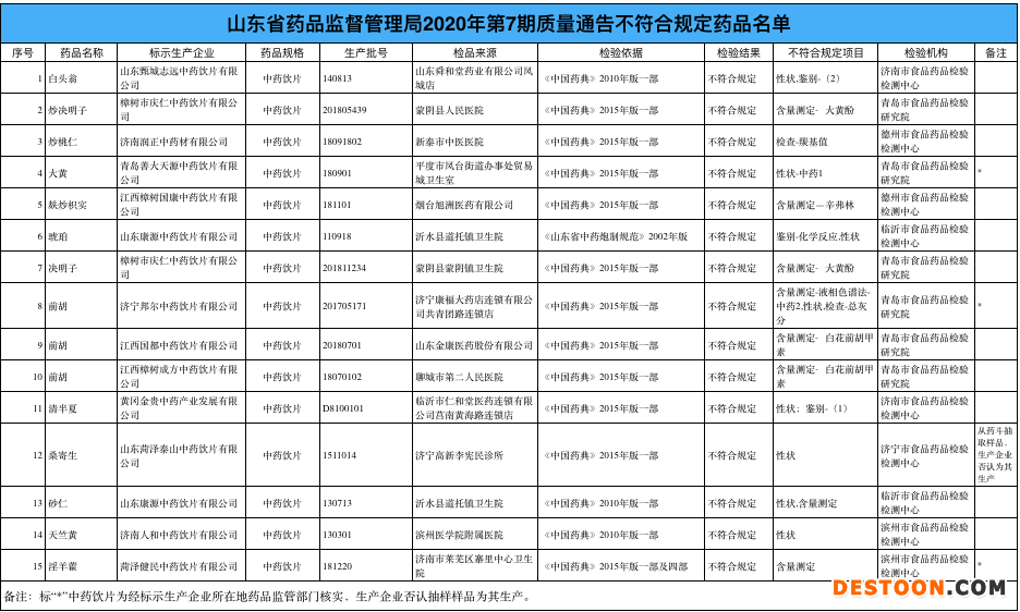 12月10日訊 12月8日,山東省藥品監(jiān)管局發(fā)布2020年第7期藥品質量抽檢公告,15批次藥品被查不合格。