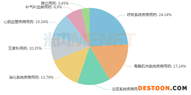 從治療類別看,29個(gè)獨(dú)家中成藥涵蓋8個(gè)治療大類,呼吸系統(tǒng)疾病用藥獨(dú)占鰲頭,占比達(dá)24.14%,骨骼肌肉系統(tǒng)疾病用藥以17.24%的占比緊接其后,泌尿系統(tǒng)疾病用藥、消化系統(tǒng)疾病用藥以13.79%的占比并列第三。