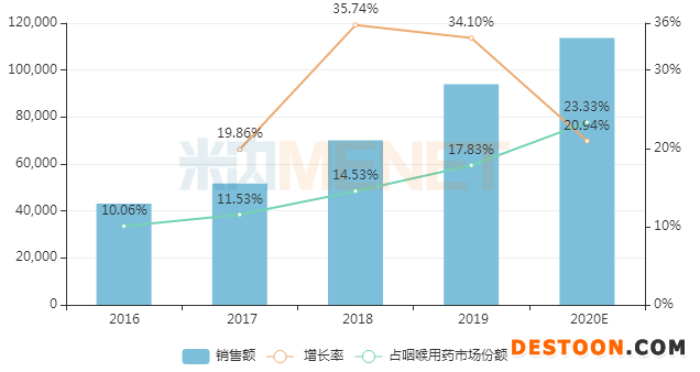 藍(lán)芩口服液具有清熱解毒、利咽消腫的功效,可用于急性咽炎、肺胃實(shí)熱證所致的咽痛、咽干、咽部灼熱等,為全國醫(yī)保乙類品種。近幾年來,藍(lán)芩口服液在中國城市實(shí)體藥店終端銷售額逐年上漲,占咽喉用藥市場比重逐年上升,預(yù)計(jì)2020年銷售額首次突破10億元,同比增長20.94%,占咽喉用藥市場比重23.33%。