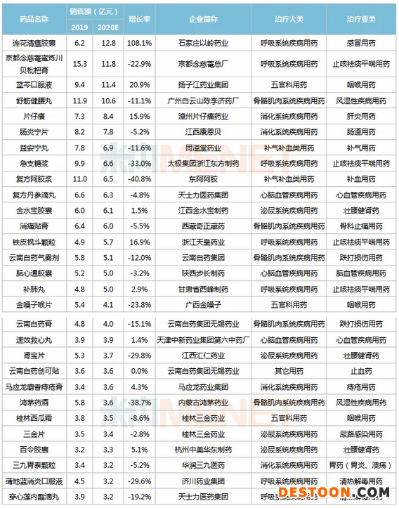 2個(gè)獨(dú)家中成藥首次突破10億元,為石家莊以嶺藥業(yè)的連花清瘟膠囊(增速108.1%)及揚(yáng)子江藥業(yè)的藍(lán)芩口服液(增速20.9%),其中連花清瘟膠囊將取代京都念慈菴蜜煉川貝枇杷膏成為2020E中國城市實(shí)體藥店終端最暢銷的獨(dú)家中成藥。
