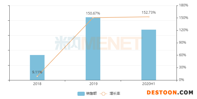 2018年5月,恒瑞的6類仿制獲批上市成為國內首仿,隨后信泰制藥于2019年也加入了戰(zhàn)局。2019年該產品在中國城市公立醫(yī)院、縣級公立醫(yī)院、城市社區(qū)中心及鄉(xiāng)鎮(zhèn)衛(wèi)生院(簡稱中國公立醫(yī)療機構)終端銷售額呈現(xiàn)爆發(fā)式增長,一舉沖破1億元大關,2020上半年增速保持在150%以上,市場潛力驚人。