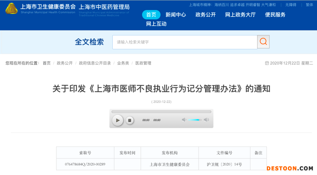12月22日,上海市衛(wèi)健委正式發(fā)布《上海市醫(yī)師不良執(zhí)業(yè)行為記分管理辦法》的通知,上述辦法自2021年2月15日起施行,有效期至2026年2月14日。