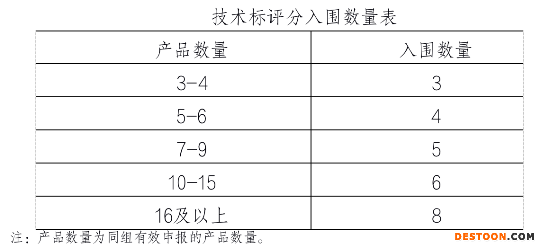 同一目錄,申報(bào)企業(yè)數(shù)量大于或等于3家的,將“技術(shù)標(biāo)評分”得分由高到低排序,按照“技術(shù)標(biāo)評分入圍數(shù)量表”的相應(yīng)數(shù)量,依次確定進(jìn)入綜合評分環(huán)節(jié)的產(chǎn)品(若最后一名得分相同時(shí),均進(jìn)入綜合評審環(huán)節(jié))。