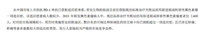 君實生物特瑞普利單抗面對的適應癥人群同樣較少,在2019年的新發(fā)黑色素瘤病人中,既往標準治療失敗之后的局部進展或轉移性黑色素瘤患者僅為2400人。