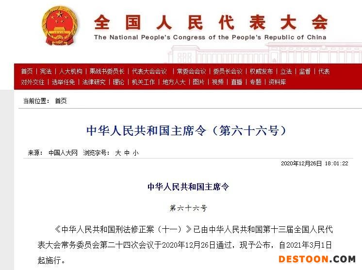 12月31日訊 據(jù)全國人大官網(wǎng)消息,《中華人民共和國刑法修正案(十一)》已由中華人民共和國第十三屆全國人民代表大會常務(wù)委員會第二十四次會議于2020年12月26日通過,自2021年3月1日起施行。