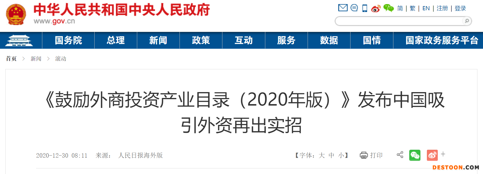 12月30日,國務(wù)院官網(wǎng)發(fā)布消息顯示,近日國家發(fā)改委和商務(wù)部公開發(fā)布《鼓勵(lì)外商投資產(chǎn)業(yè)目錄(2020年版)》(下稱《鼓勵(lì)目錄》),目錄從1108條增加到1235條,一年內(nèi)增加127條,增幅超過10%。