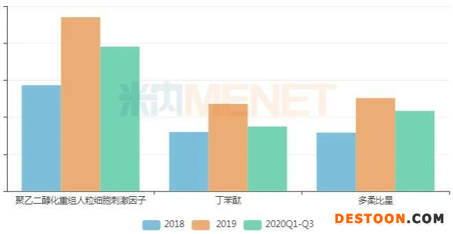 近年聚乙二醇化重組人粒細(xì)胞刺激因子/丁苯酞/多柔比星注射劑銷售情況(單位:億元)
