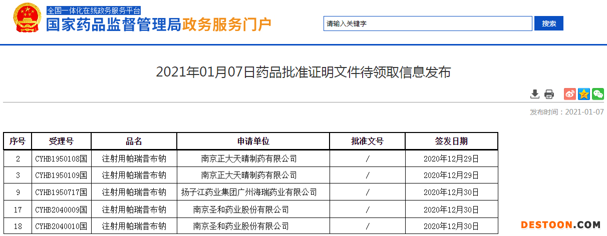 1月8日訊 1月7日,NMPA官網(wǎng)顯示,南京正大天晴、揚(yáng)子江藥業(yè)集團(tuán)、南京圣和藥業(yè)的注射用帕瑞昔布鈉通過一致性評(píng)價(jià)。1月6日,海正藥業(yè)公告稱,公司的注射用帕瑞昔布鈉過評(píng)。注射用帕瑞昔布鈉為第四批集采品種,截至目前已有11家藥企過評(píng)。