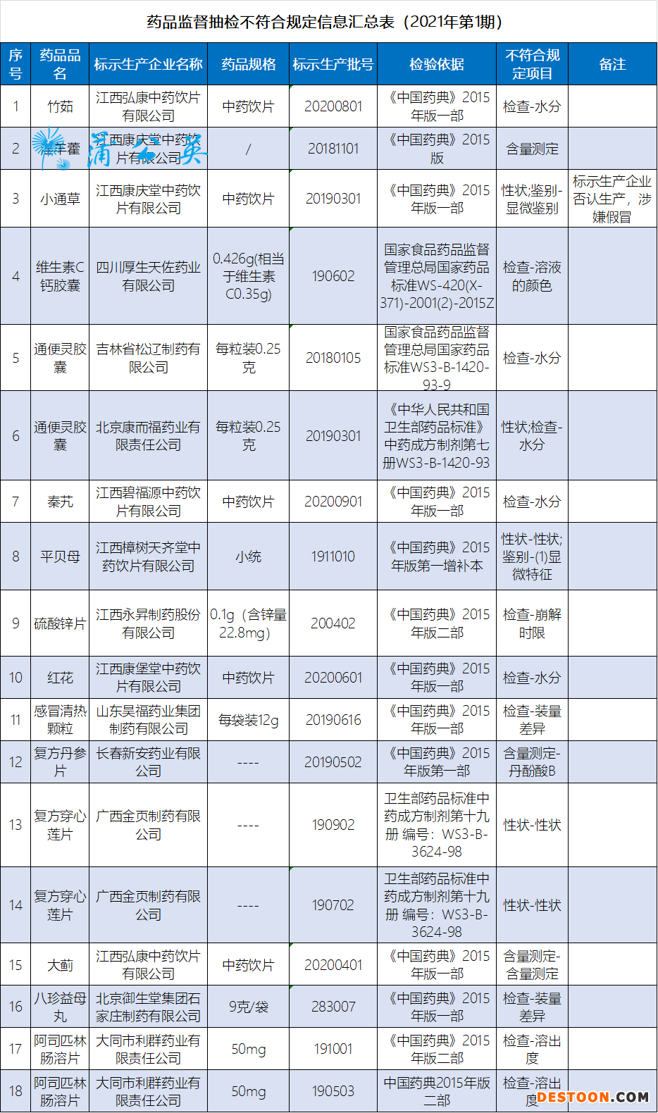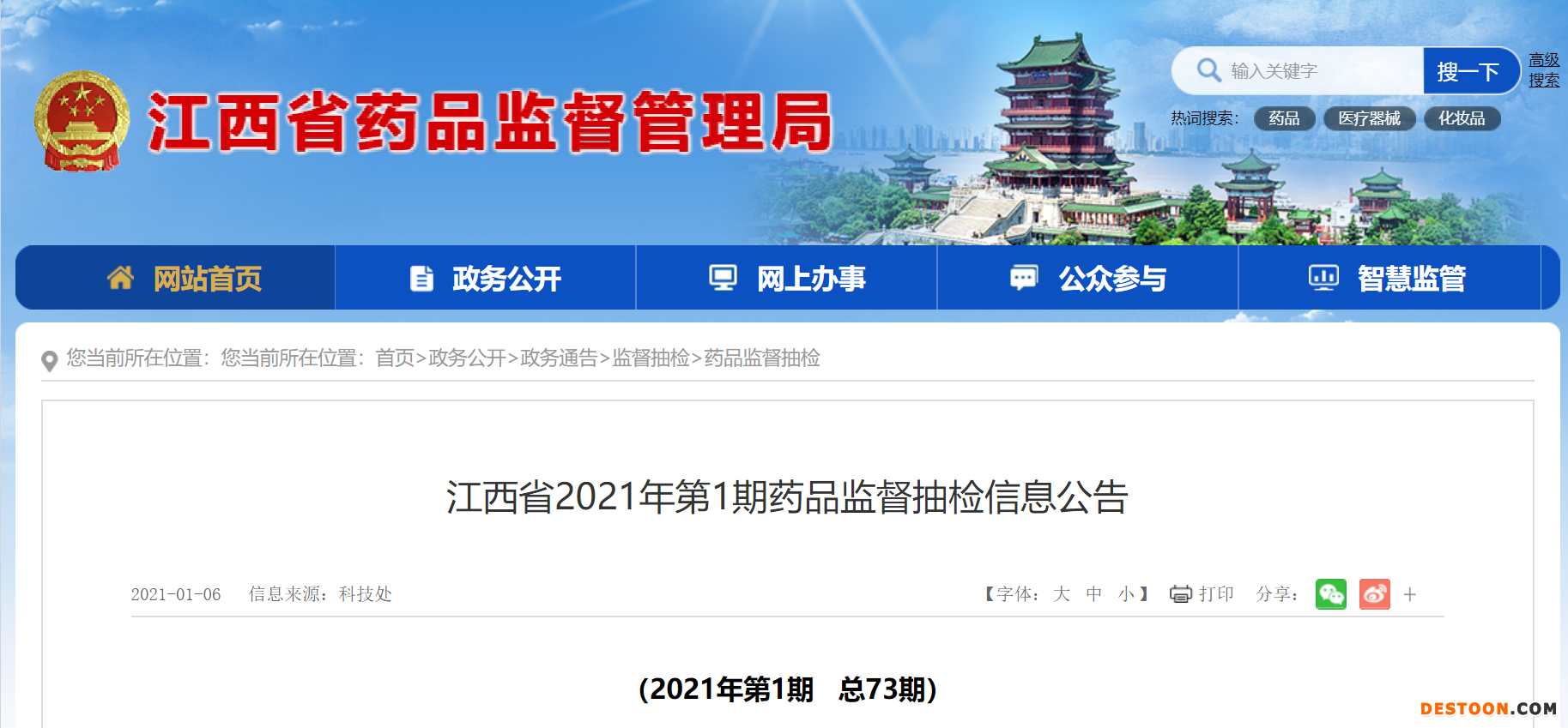 1月8日訊 2021年1月6日江西省藥監(jiān)局發(fā)布江西省2021年第1期藥品監(jiān)督抽檢信息公告。共有15個(gè)品種18批次不符合標(biāo)準(zhǔn)規(guī)定。