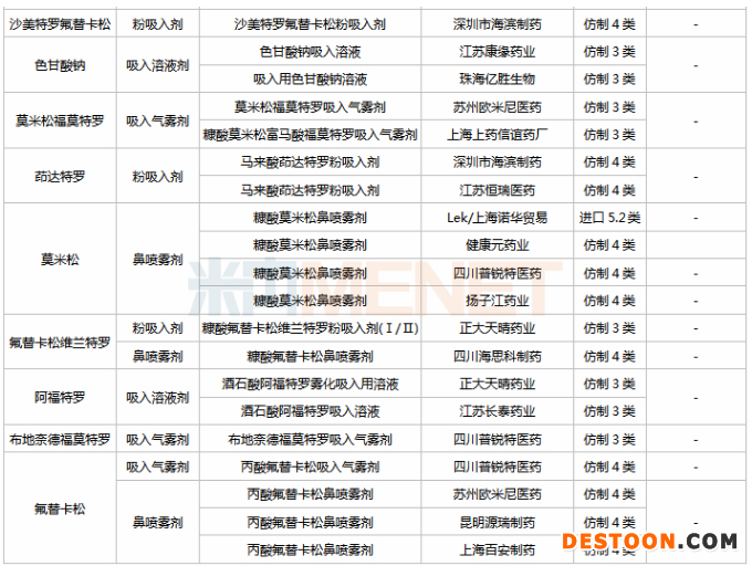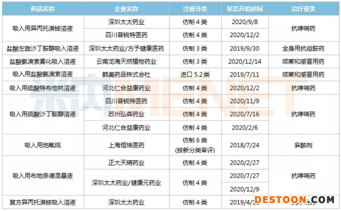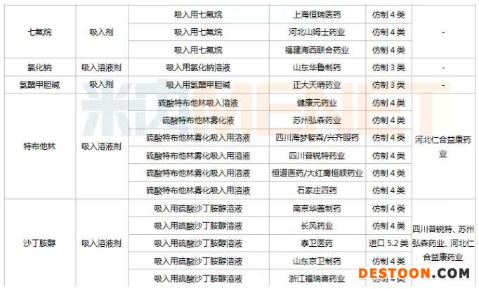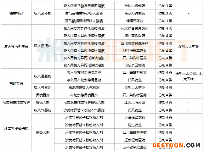 吸入用氯醋甲膽堿、馬來酸茚達特羅粉吸入劑、烏美溴銨維蘭特羅粉吸入劑、莫米松福莫特羅吸入氣霧劑等16個品種暫無仿制藥獲批上市,其中9個品種有企業(yè)獨家以新分類報產(chǎn),獲得首仿的幾率較大,四川普銳特、正大天晴、長風藥業(yè)分別有3個、3個、2個。