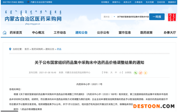1月11日訊 1月8日,內(nèi)蒙古自治區(qū)醫(yī)藥采購網(wǎng)發(fā)布《關(guān)于公布國家組織藥品集中采購未中選藥品價(jià)格調(diào)整結(jié)果的通知》。梳理附件的兩份調(diào)整結(jié)果名單可以看到,重慶華邦的阿那曲唑片、山東裕欣的鹽酸氨溴索片等169個(gè)符合要求的未中選藥品的采購方式將被調(diào)整為限價(jià)掛網(wǎng);而貴州天安的鹽酸二甲雙胍片等7個(gè)品種則被取消掛網(wǎng),中美上海施貴寶的阿哌沙班片、中美天津史克的布洛芬緩釋膠囊等43個(gè)未報(bào)價(jià)和報(bào)價(jià)不符合要求的藥品被予以暫停交易資格。