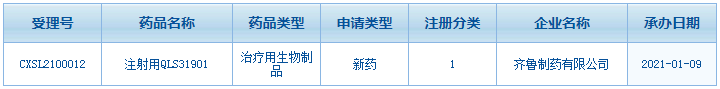 醫(yī)藥網(wǎng)1月12日訊 1月9日,齊魯制藥的1類新藥注射用QLS31901臨床申請(qǐng)獲得CDE承辦受理,受理號(hào)為CXSL2100012。注射用QLS31901是齊魯制藥2021年首個(gè)申報(bào)臨床的1類新藥。近年來(lái),齊魯制藥在創(chuàng)新藥領(lǐng)域頻頻發(fā)力,2020年共有4款1類新藥提交臨床申請(qǐng),均為治療用生物制品。