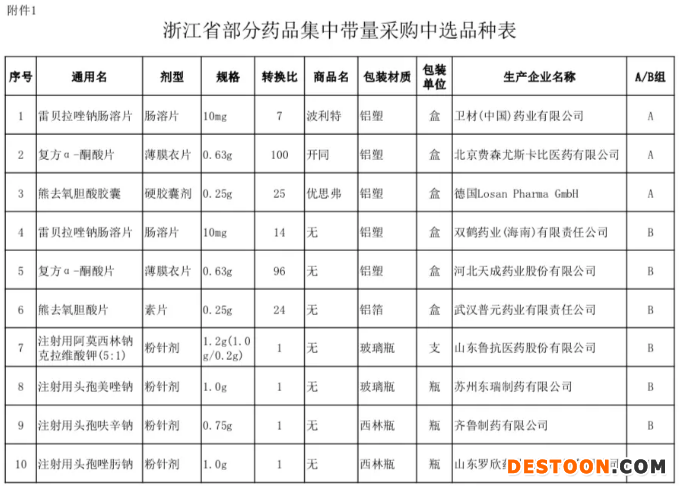 據(jù)賽柏藍(lán)梳理,根據(jù)浙江省部分藥品集中帶量采購(gòu)中選品種表,除亮丙瑞林注射劑外,雷貝拉唑鈉腸溶片、熊去氧膽酸膠囊、熊去氧膽酸片、注射用阿莫西林鈉克拉維酸鉀(5:1)、注射用頭孢呋辛鈉、注射用頭孢美唑鈉、注射用頭孢唑肟鈉、復(fù)方α-酮酸片均有企業(yè)中選。