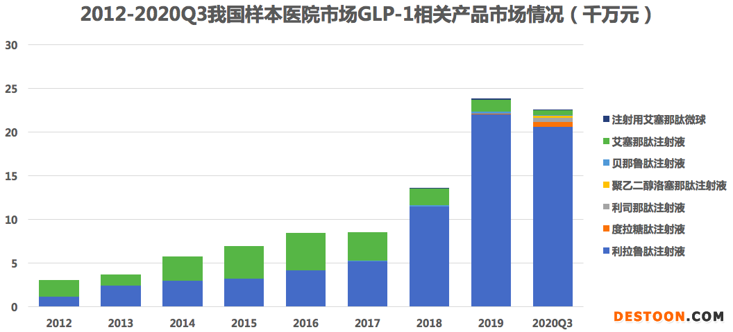 藥物綜合數(shù)據(jù)庫(kù)(PDB)顯示,在我國(guó)GLP-1樣本醫(yī)院中,由于短效GLP-1上市較早,其市場(chǎng)份額占據(jù)主導(dǎo)。其中,利拉魯肽注射液市場(chǎng)份額增長(zhǎng)最快,從2012年的37%上升至2020年Q1-3的91%。