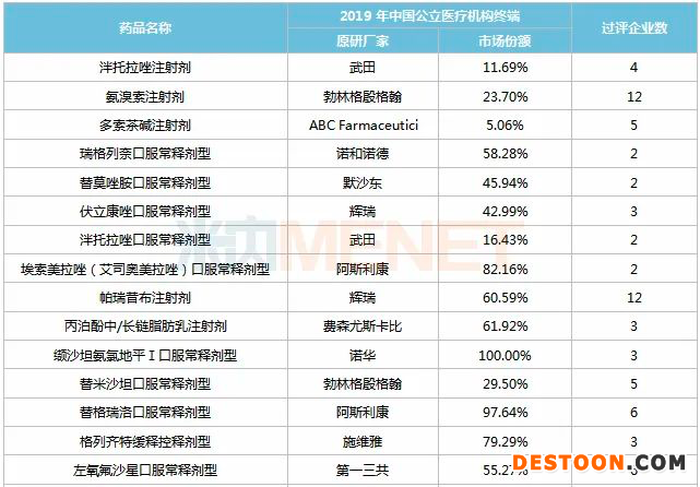 此外這21個(gè)藥品中有11個(gè)藥品的原研廠家在2019年中國公立醫(yī)療機(jī)構(gòu)終端競爭格局中的市場份額超過50%,其中纈沙坦氨氯地平Ⅰ口服常釋劑型、索拉非尼口服常釋劑型基本由原研廠家獨(dú)占。