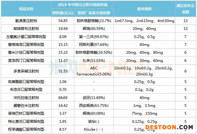 諾華和勃林格殷格翰均有5個(gè)品種被納入第四批集采,輝瑞和阿斯利康均有3個(gè)品種涉及。45個(gè)品種中,21個(gè)品種的原研藥企2019年在中國公立醫(yī)療機(jī)構(gòu)終端占據(jù)的市場份額超過50%,其中7個(gè)品種由原研藥企獨(dú)占市場,且索拉非尼口服常釋劑型、纈沙坦氨氯地平Ⅰ口服常釋劑型銷售額超過10億元。
