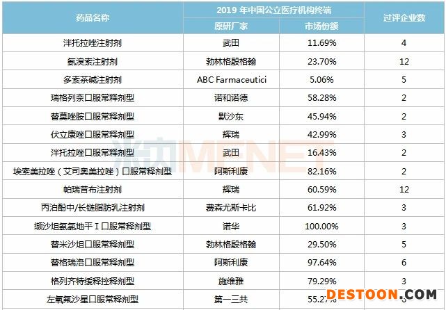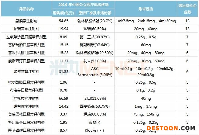 米內(nèi)網(wǎng)數(shù)據(jù)顯示,45個(gè)通用名藥品在2019年中國(guó)城市公立醫(yī)院、縣級(jí)公立醫(yī)院、城市社區(qū)中心以及鄉(xiāng)鎮(zhèn)衛(wèi)生院(簡(jiǎn)稱中國(guó)公立醫(yī)療機(jī)構(gòu))終端合計(jì)銷售額550億元,其中有21個(gè)藥品銷售額超過(guò)10億元,泮托拉唑注射劑以66.7億元領(lǐng)跑,氨溴索注射劑以59.8億元緊接其后。