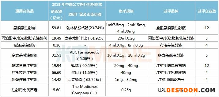 第一、二、三批集采涉及的注射劑品種分別有3個(gè)、1個(gè)、3個(gè)。相較前三批集采,第四批集采涉及的注射劑品種多達(dá)8個(gè),數(shù)量創(chuàng)新高。8個(gè)注射劑分別為鹽酸氨溴索注射液、丙泊酚中/長(zhǎng)鏈脂肪乳注射液、布洛芬注射液、多索茶堿注射液、注射用帕瑞昔布鈉、注射用泮托拉唑鈉、注射用硼替佐米及注射用比伐蘆定。其中6個(gè)注射劑2019年在中國(guó)公立醫(yī)療機(jī)構(gòu)終端銷售額超過(guò)10億元,且氨溴索注射劑、泮托拉唑注射劑銷售額分別超過(guò)50億元、60億元。