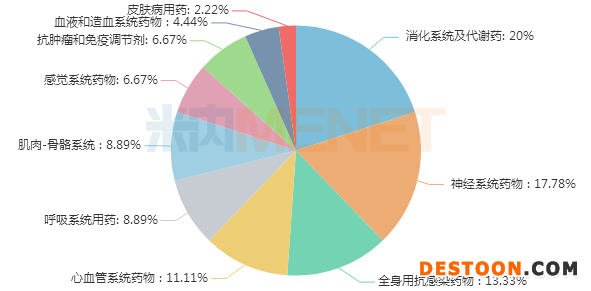45個(gè)藥品涵蓋10個(gè)治療類別,涉及藥品數(shù)量TOP3類別分別為神經(jīng)系統(tǒng)藥物、全身用抗感染藥物、消化系統(tǒng)及代謝藥,涉及的藥品數(shù)量分別有9、8、6個(gè)。米內(nèi)網(wǎng)數(shù)據(jù)顯示,2019年中國(guó)公立醫(yī)療機(jī)構(gòu)化學(xué)藥終端神經(jīng)系統(tǒng)藥物、全身用抗感染藥物、消化系統(tǒng)及代謝藥三大治療領(lǐng)域銷售規(guī)模均超過(guò)1000億元。三大治療領(lǐng)域多個(gè)品種被納入此次集采,將對(duì)其用藥格局帶來(lái)影響。