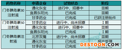從門冬胰島素研發(fā)進(jìn)展來(lái)看,甘李藥業(yè)、通化東寶、宜昌東陽(yáng)光等藥企跑在前面。其中,甘李藥業(yè)已經(jīng)獲得門冬胰島素30注射液注冊(cè)批件,東陽(yáng)光已經(jīng)完成三期試驗(yàn);通化東寶則在進(jìn)行門冬胰島素50注射液三期試驗(yàn)。