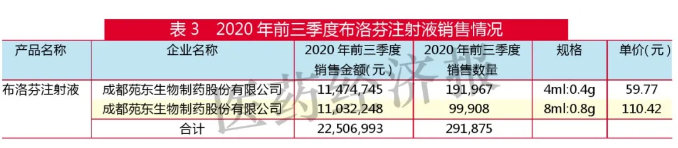 2020年前三季度,非甾體抗炎藥布洛芬各種劑型在樣本醫(yī)院的銷售額為7641萬元(骨骼與肌肉用藥的放大倍數(shù)為2.65,則放大至全國公立醫(yī)院購藥金額為7641萬元×2.65約為2.025億元,下同),布洛芬注射液2個(gè)規(guī)格的銷售額為2251萬元,約占29.46%,不到三分之一。