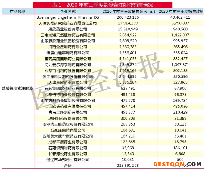數(shù)據(jù)顯示,2020年前三季度祛痰藥氨溴索各種劑型在樣本醫(yī)院的銷售額為4.238億元(呼吸系統(tǒng)用藥的放大倍數(shù)為3.12,則放大至全國公立醫(yī)院購藥金額為4.238×3.12約為13.22億元,下同),氨溴索注射液3個(gè)規(guī)格的銷售額為2.856億元,約占67.39%,超過三分之二。