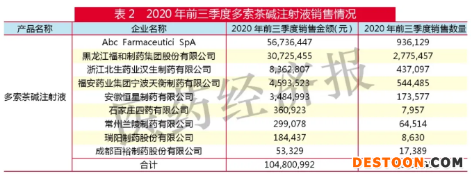 從表2可知,Abc Farmaceutici SpA和黑龍江福和制藥占主要份額,共有10家廠家顯示銷售。
