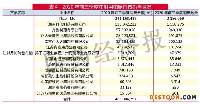 從表4可以看出,輝瑞的銷售處于領(lǐng)先地位,湖南科倫和齊魯制藥次之,共有14家廠家顯示銷售。從2016-2020年的樣本醫(yī)院銷售數(shù)據(jù)來看,注射用帕瑞昔布銷售額呈現(xiàn)上升趨勢,從2016年的2.780億元上升到2019年的5.909億元,2020年前三季度銷售額為4.650億元,預(yù)計(jì)2020年全年銷售將突破6億元。