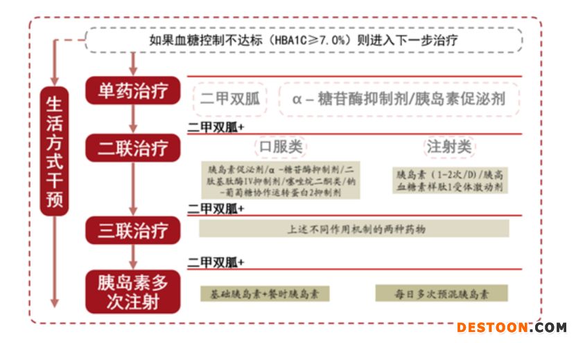 根據(jù)我國《關(guān)于糖尿病的新診斷標(biāo)準(zhǔn)與分型》,對于糖尿病人的診療方式分為4個階段,第一階段是單藥治療,如果血糖控制不達標(biāo)則進入下一步治療,即二甲雙胍+進行二聯(lián)治療、三聯(lián)治療甚至胰島素多次注射。其中,二甲雙胍+GLP-1為二聯(lián)治療方案之一。