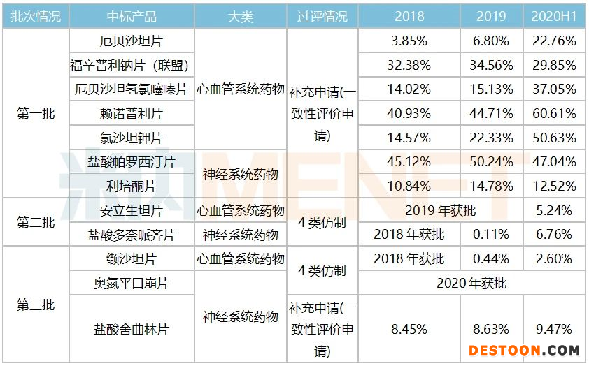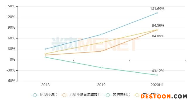 第一批國(guó)采中標(biāo)的7個(gè)產(chǎn)品全部是按一致性評(píng)價(jià)補(bǔ)充申請(qǐng)獲批過(guò)評(píng),這些產(chǎn)品進(jìn)入市場(chǎng)已有些時(shí)日,但華海藥業(yè)借助國(guó)采的契機(jī)大幅提升了市場(chǎng)覆蓋率,厄貝沙坦片、厄貝沙坦氫氯噻嗪片、賴(lài)諾普利片、氯沙坦鉀片在中國(guó)城市公立醫(yī)院、縣級(jí)公立醫(yī)院、城市社區(qū)中心及鄉(xiāng)鎮(zhèn)衛(wèi)生院(簡(jiǎn)稱(chēng)中國(guó)公立醫(yī)療機(jī)構(gòu))終端的市場(chǎng)份額年年遞增,厄貝沙坦片2020上半年銷(xiāo)售額增速更高達(dá)131.69%;從市場(chǎng)競(jìng)爭(zhēng)的角度看,華海藥業(yè)已一躍成為厄貝沙坦氫氯噻嗪片、賴(lài)諾普利片、氯沙坦鉀片以及鹽酸帕羅西汀片的領(lǐng)軍企業(yè)。