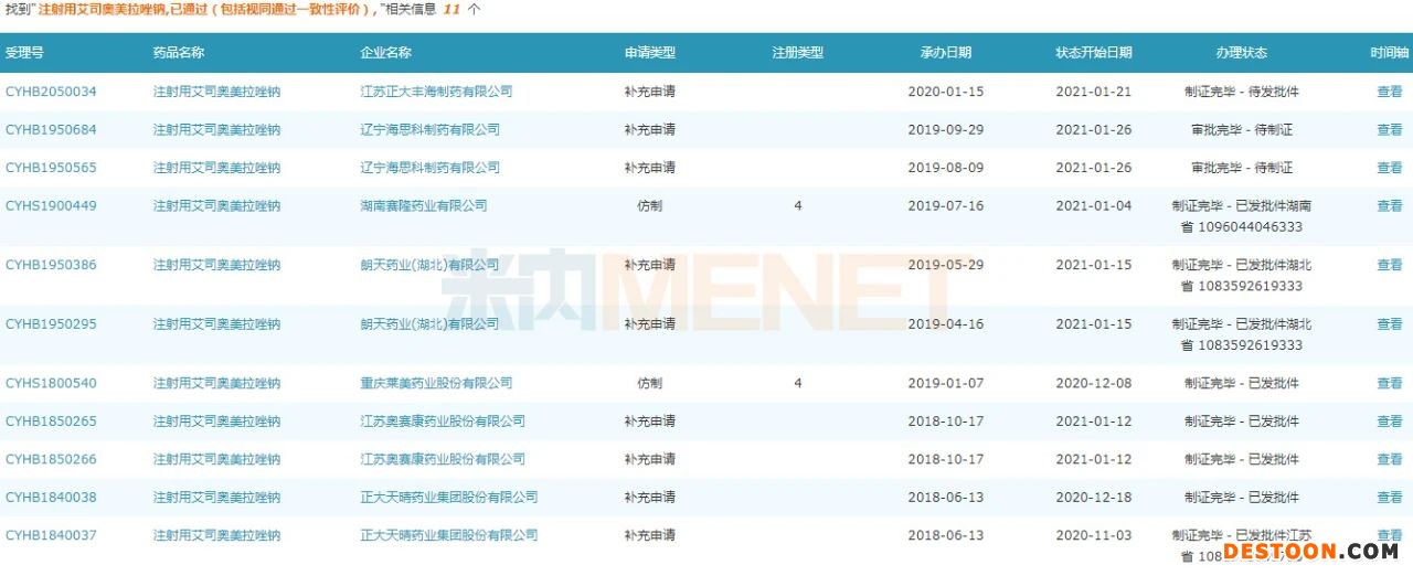 截至目前,注射用艾司奧美拉唑鈉有7家企業(yè)過評(píng),其中,正大天晴藥業(yè)集團(tuán)、江蘇奧賽康藥業(yè)、朗天藥業(yè)、江蘇正大豐海制藥、遼寧海思科制藥以補(bǔ)充申請(qǐng)獲批,重慶萊美藥業(yè)、湖南賽隆藥業(yè)以仿制4類申報(bào)上市獲批,視同過評(píng)。