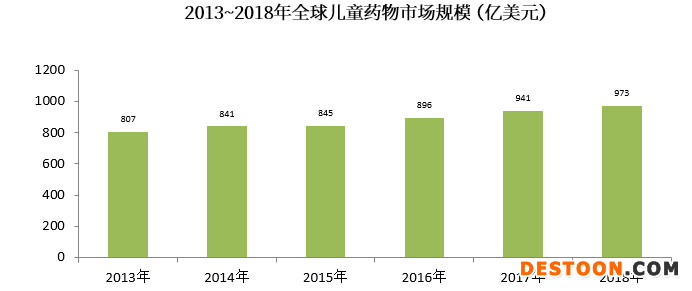 2013年~2018年全球兒童藥物市場規(guī)模呈逐年上升趨勢,近5年復合增長率(CAGR)為3.76%,2018年全球兒童藥物市場規(guī)模約為973億美元。