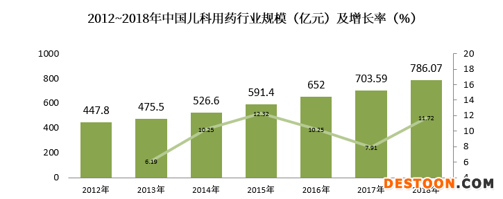 國內(nèi)市場兒童藥物規(guī)模與國際市場相匹配,2012年~2018年CAGR為+9.83%,2018年我國兒科用藥市場規(guī)模約為786.07億元,較上年同比增長11.72%,國內(nèi)兒科用藥市場規(guī)模增長迅速。