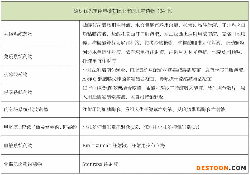 在兒童藥物優(yōu)先審評審批方面,2016-2019年國家局已陸續(xù)將989個品種納入優(yōu)先審評程序中,其中兒童藥物96件(占比為9.7%),已有80多個企業(yè)享受優(yōu)惠政策。截至目前,通過兒童用藥優(yōu)先審評審批上市的產(chǎn)品共計34個,詳見下表。