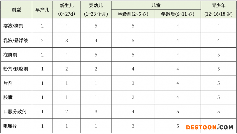 歐盟針對不同年齡段兒童進行了劑型(口服給藥途徑)推薦: