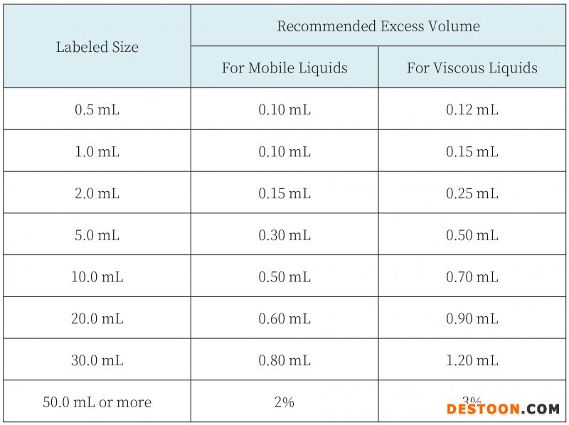 〔2〕USP General Chapter<1151>: Each container of an injection is filled with a volume in slight excess of the labled “size” or the volume that is to be withdrawn. The excess volumes recommended in the accompanying table are usually sufficient to permit withdrawal and administration of the labeled volumes.