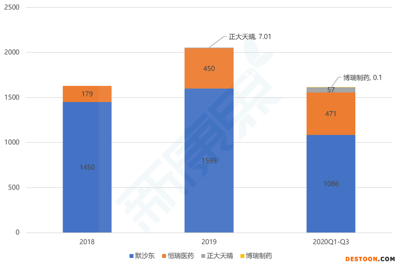 2014年,卡泊芬凈的專利到期。2017年1月,恒瑞醫(yī)藥宣布國內(nèi)首仿注射用醋酸卡泊芬凈獲批上市,公告中透露的研發(fā)投入高達(dá)3054萬元。2019年6月,正大天晴的二仿獲批上市。2020年1月和8月,博銳制藥和海思科的仿制藥產(chǎn)品分別獲批上市。截至2021年2月,注射用醋酸卡泊芬凈在國內(nèi)的仿制藥產(chǎn)品仍然只有以上4款,競爭格局比較寬松。