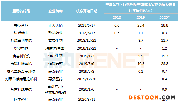 近日,米內(nèi)網(wǎng)對2018年-2020年國產(chǎn)1類創(chuàng)新藥在中國公立醫(yī)療機構(gòu)終端及中國城市實體藥店終端的銷售額進(jìn)行梳理,包括國產(chǎn)PD-1單抗、已有四個適應(yīng)癥上市的安羅替尼、豪森的阿美替尼等。