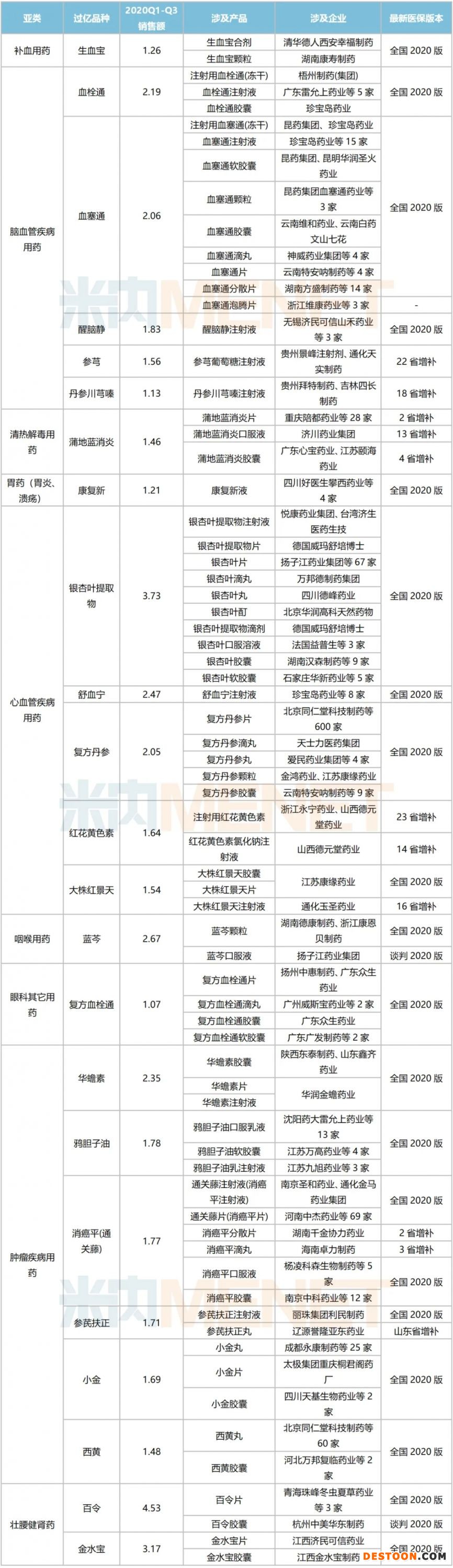 心血管疾病用藥中過億的非獨(dú)家品種涉及銀杏葉提取物、舒血寧、復(fù)方丹參、紅花黃色素以及大株紅景天。