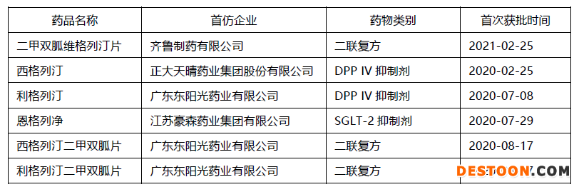 仿制藥方面,二肽基肽酶-4(DDP4)抑制劑及其與二甲雙胍的二聯(lián)復(fù)方成為研發(fā)競(jìng)賽的主戰(zhàn)場(chǎng)。2020年以來,已有2個(gè)DDP4抑制劑單方和3個(gè)與二甲雙胍配伍的二聯(lián)復(fù)方國產(chǎn)首仿藥獲批上市,近30億進(jìn)口藥壟斷市場(chǎng)有望被打破。DPP-4抑制劑憑借其對(duì)體質(zhì)量無影響、低血糖發(fā)生率低、可口服等顯著特點(diǎn),在國內(nèi)外臨床指南中逐步得到充分認(rèn)可,治療地位不斷提升,隨著我國醫(yī)保目錄覆蓋品種范圍的擴(kuò)大,市場(chǎng)份額有望進(jìn)一步提升。