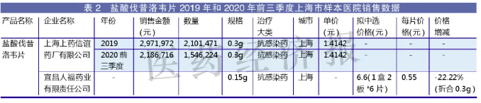 2020年前三季度,鹽酸伐昔洛韋在全國樣本醫(yī)院的銷售額為5735萬元。在上海市樣本醫(yī)院,2019和2020年有銷售數(shù)據(jù)的只有上海上藥信誼藥廠有限公司的0.3g鹽酸伐昔洛韋片,2019年其在上海市樣本醫(yī)院的銷售額為297.2萬元。