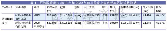 2020年前三季度,阿魏酸哌嗪在全國樣本醫(yī)院的銷售額為1814萬元。在上海市樣本醫(yī)院,2019和2020年有銷售數(shù)據(jù)的只有成都亨達(dá)藥業(yè)有限公司的50mg阿魏酸哌嗪片劑,2019年在上海市樣本醫(yī)院的銷售額是81.85萬元,市場(chǎng)量很小。