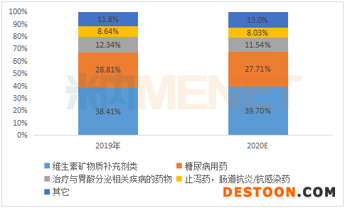 圖4:2019-2020E化學(xué)藥消化系統(tǒng)及代謝藥亞類份額及走勢(shì)
