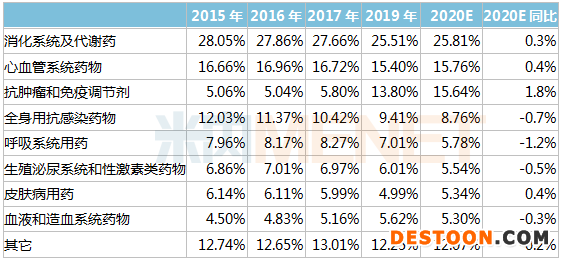 圖4:2019-2020E化學(xué)藥消化系統(tǒng)及代謝藥亞類份額及走勢