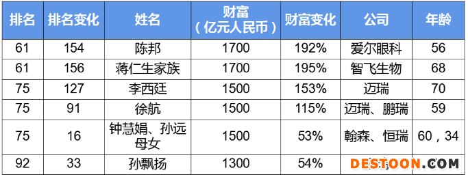 受新冠疫情影響,生物科技是過去一年增長最快的行業(yè)之一,大健康行業(yè)十億美金企業(yè)家大幅增加。位列大健康行業(yè)第一的是愛爾眼科創(chuàng)始人陳邦,榜單顯示,56歲的陳邦財富去年增長兩倍,達到1700億元人民幣。其次是智飛生物的蔣仁生家族和邁瑞的李西廷、徐航。得益于翰森和恒瑞醫(yī)藥的快速增長,孫飄揚和鐘慧娟夫婦的總財富增長超過50%,至2800億元人民幣。