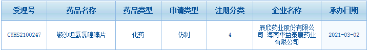 3月3日訊 3月2日,CDE官網(wǎng)顯示,辰欣藥業(yè)|海南華益泰康藥業(yè)的纈沙坦氫氯噻嗪片以仿制4類提交上市申請獲受理。米內(nèi)網(wǎng)數(shù)據(jù)顯示,2019年在中國公立醫(yī)療機構(gòu)終端和中國城市實體藥店終端纈沙坦氫氯噻嗪片劑合計銷售額超過10億元。