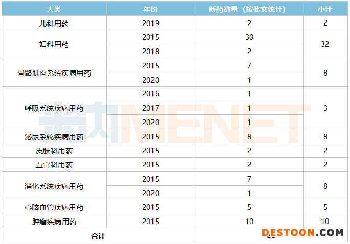 從大類來看,婦科用藥獲批的新藥最多,涉及婦女更年期用藥、乳腺增生藥、婦科炎癥用藥以及婦科調(diào)經(jīng)藥四個(gè)亞類,這得益于前幾年國(guó)家對(duì)婦兒用藥實(shí)施了直接掛網(wǎng)采購政策。方盛制藥獲批數(shù)量最多,涉及兩個(gè)產(chǎn)品,其余30家藥企均獲批了1個(gè)新藥。